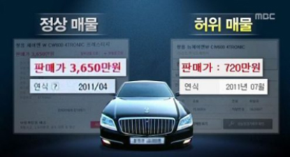 해답은 의외로 간단합니다. 인터넷에서 보신 매물들이 ▛허위매물▟ 이었던 것입니다. 즉 중고차 매매시장에서 통상적으로 3,650만원 정도에 거래되는 차를 720만원이라는 터무니없이 싼 가격에 팔겠다고 광고로 올린 매물이었던 것입니다.